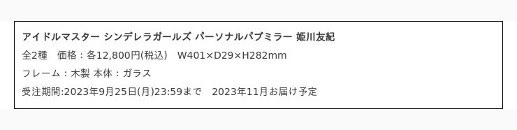 株式会社バンダイナムコアミューズメントは、『アイドルマスター シンデレラガールズ パーソナルパブミラー 姫川友紀』を9月14日(木)に発売します。「姫川友紀」は、「アイドルマスター シンデレラガールズ」に登場するアイドルの一人。9月14日生まれ、身長161cm。趣味は野球観戦という宮崎県出身の20歳です。同日より株式会社バンダイナムコエンターテインメントが運営するECサイト、「アソビストア」にて期間限定の受注販売を開始します。