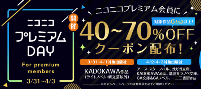 「ニコニコプレミアムDAY」連動キャンペーン 最大70%OFFクーポン配布!〜6出版社6万点以上が対象〜