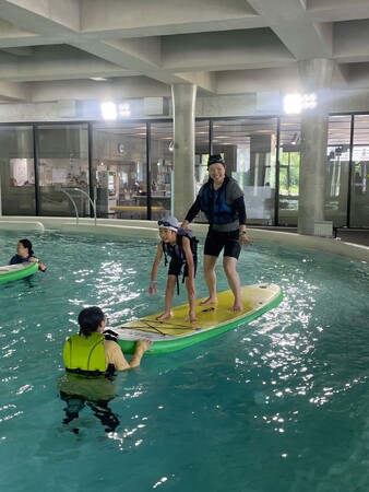 1時間のプログラムの中では、プールの特性である「水流」を活用した水中運動から始まり、安全管理・啓蒙の観点から本格的なライフジャケット(PFD)を着用して活動を行ないました。最後には、親子でSUPの上に乗りバランスをとる運動や、リレー形式でSUPを操作しながら身体を動かす機会を提供しました。