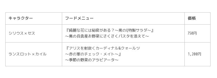 『イケメン革命◆アリスと恋の魔法』に登場する赤の軍、黒の軍、不思議の国の人々の全14キャラクターをモチーフとしたオリジナルコラボメニューが期間限定で登場します。ノンアルコールドリンク14種類(プラス100円でアルコールへの変更も可)、フードメニュー4種類、デザートメニュー3種類の全21種類のコラボメニューをお楽しみいただけます。また、ドリンクとフードメニューについては、期間によってお楽しみいただける内容が変わり、デザートメニューは、コラボ期間中、同一メニューをお召し上がりいただけます。