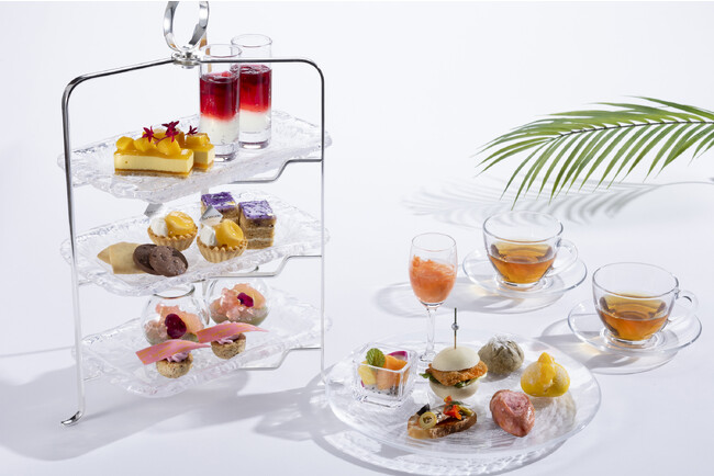 7月8日(土)から始まる「SWEET SENSATION (スイート センセーション) 〜TROPICAL&TEA(トロピカル&ティー)〜」では、夏の味わいのトロピカルフルーツとさまざまなお茶を掛け合わせたスイーツやセイボリーをお召し上がりいただけます。香り高いほうじ茶を練り込んだスポンジで穏やかな甘みのドラゴンフルーツをサンドしたケーキや、アールグレイの茶葉を生地に練り込み焼き上げ、刻んだココナッツをトッピングしたスコーンなどをはじめとするスイーツやセイボリーが並びます。また、南国気分を盛り上げるひんやりスイーツとして、瑞々しい桃のコンポートに深い味わいの抹茶を合わせたゼリー寄せや、クランベリーのような味わいのハイビスカスティーにさわやかな酸味のライムの香りが口の中に広がるジュレなどをラインナップ。ウイークエンド限定のスペシャリテには、香ばしいほうじ茶の香るフォンダンショコラをご用意しております。お客様の前で酸味の効いたパッションフルーツのソルベを添え、夏にふさわしいさわやかな一皿に仕上げます。また、さまざまなテイストの紅茶を、スイーツやご気分に合わせて心ゆくまでお楽しみいただきたいという想いから、世界各国で愛飲されているイギリスの高級紅茶ブランドJING TEA (ジンティー)や、ドイツの歴史ある紅茶ブランドRonnefeldt(ロンネフェルト)のスタンダードティーからフレーバードティーをご用意しております。