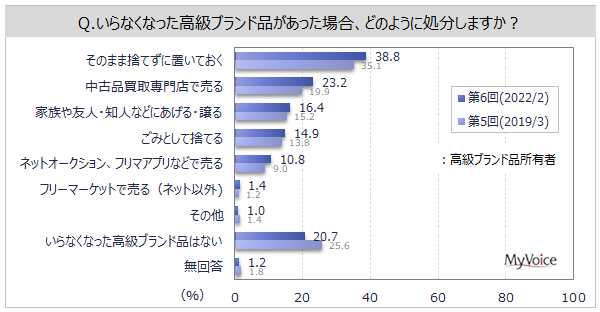 【高級ブランドに関する調査】高級ブランド品所有者は5割強、女性50〜70代では7割前後。いらなくなったブランド品の処分方法は「捨てずに置いておく」が所有者の4割弱、「中古品買取店で売る」が2割強