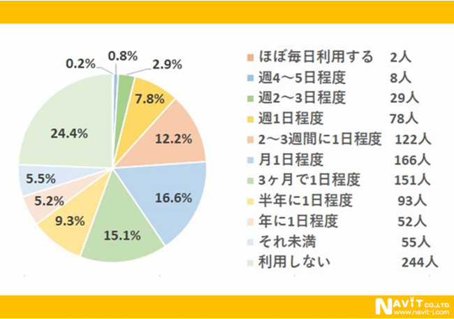 利用頻度が最も多いのは「月1日程度」で166人。割合は回答者の6分の1。次に多いのが「3ヶ月で1日程度」151人と「2〜3週間に1日程度」122人となっています。