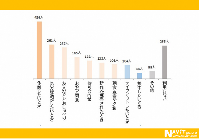どんな時に利用するかを複数回答可で尋ねたところ、「休憩したいとき」が最も多くて436人。次いで多いのは「気分転換がしたいとき」261人、「友人などとおしゃべり」237人などでした。