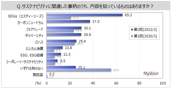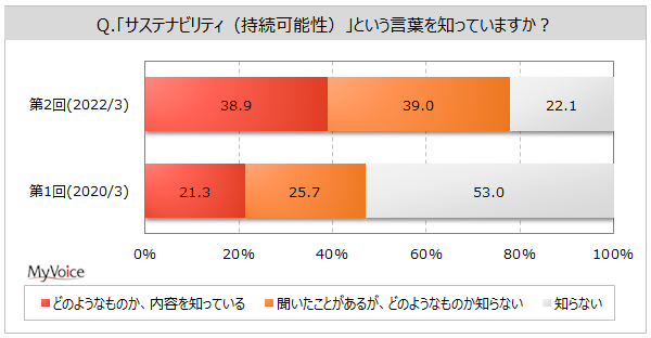 マイボイスコム株式会社(東京都千代田区、代表取締役社長:高井和久)は、インターネット調査を中心に提供している伊藤忠グループのリサーチ会社です。この度、2回目となる『サステナビリティ(持続可能性)』に関するインターネット調査を2022年3月1日〜5日に実施し、10,003件の回答を集めました。調査結果をお知らせします。