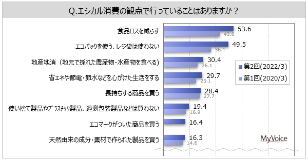 エシカル消費は、環境・社会・地域などに配慮した製品・サービスを選んで消費することで、持続可能な社会を実現する方法の一つです。その観点で行っていることは(複数回答)、「食品ロスを減らす」が53.6%、「エコバックを使う、レジ袋は使わない」が49.5%、「地産地消」「省エネや節電・節水などを心がけた生活をする」「長持ちする商品を買う」が3割前後です。2020年調査と比べて、「食品ロスを減らす」「エコバックを使う、レジ袋は使わない」が増加しています。