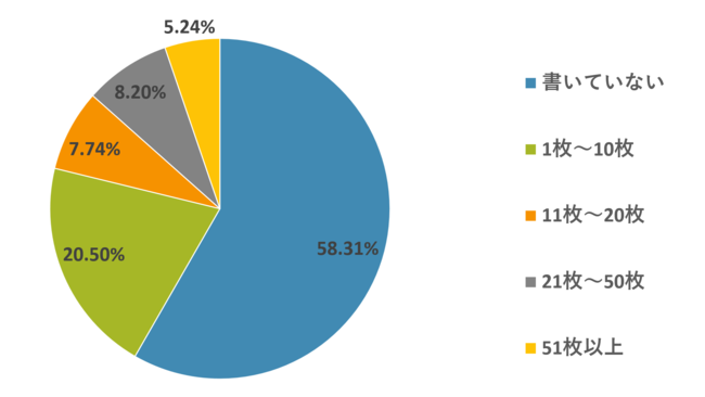 「あなたは2021年の年賀状をどのくらいの枚数書きましたか。」に対し、「書いていない(58.31%)」「1枚〜10枚(20.50%)」「11枚〜20枚(7.74%)」「21枚〜50枚(8.20%)」「51枚以上(5.24%)」と回答。