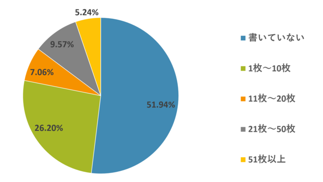 「あなたは2021年の年賀状をどのくらいの枚数書きましたか。」に対し、「書いていない(51.94%)」「1枚〜10枚(26.20%)」「11枚〜20枚(7.06%)」「21枚〜50枚(9.57%)」「51枚以上(5.24%)」と回答。
