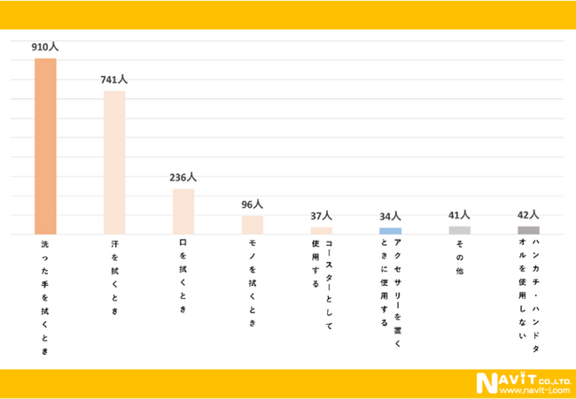 この質問は複数回答です。やはりというべきでしょうか、1番多かったので「洗った手を拭くとき」で910人となっています。次に「汗を拭くとき」が741名です。夏場はこちらの用途の方が出番が多いかもしれません。「口を拭くとき」が236人と続いています。