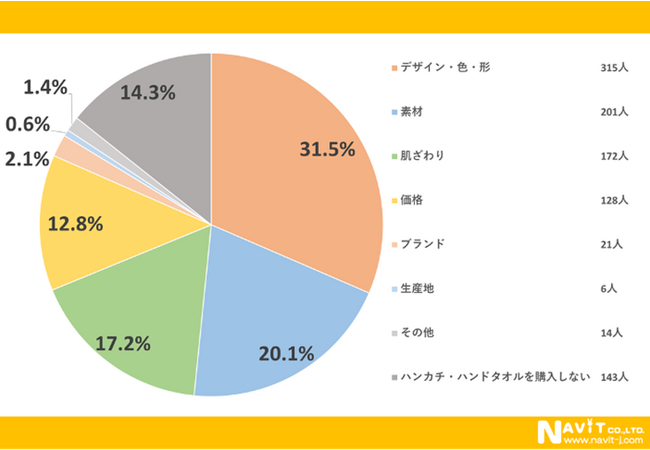 ハンカチやハンドタオルを選ぶ際の基準は「デザイン・色・形」を重視するという方が31.5%いらっしゃいます。「素材」(20.1%)と「肌触り」(17.2%)のような質感や使い心地に直結する部分を重視される方が合わせて37.3%もいらっしゃいます。やはりゴワゴワした物で汗を拭くのは嫌ですからね。