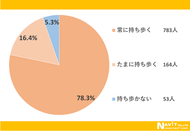 ハンカチ、ハンドタオルを「常に持ち歩く」という方が全体の78.3%です。「たまに持ち歩く」という方と合わせると94.7%の方がハンカチやハンドタオルを持ち歩いているということになります。