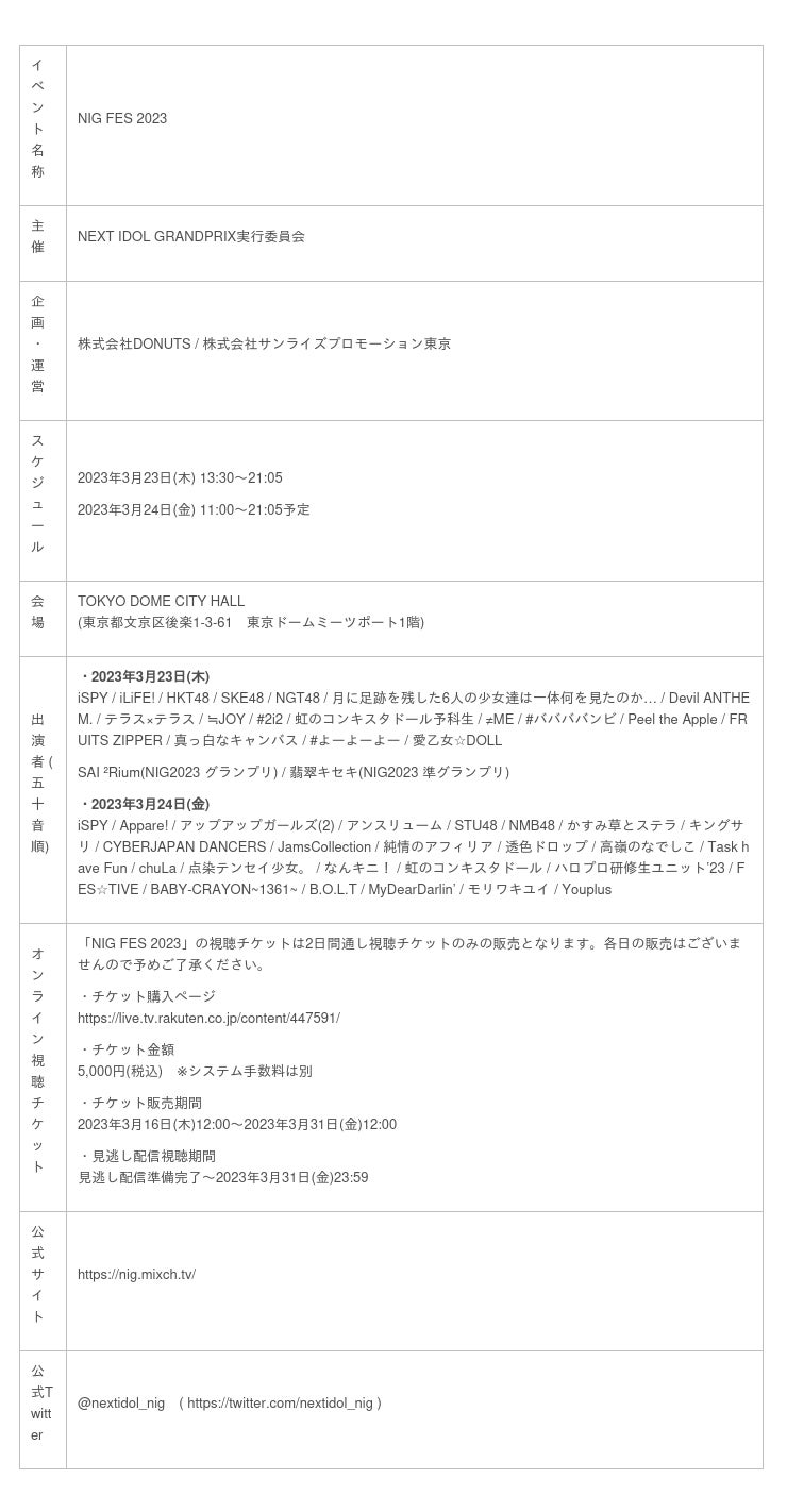 NEXT IDOL GRANDPRIX 実行委員会は、「SKE48」「HKT48」「NGT48」「≠ME」「≒JOY」など人気アイドルが出演した「NIG FES 2023」の1日目を、2023年3月23日(木)にTOKYO DOME CITY HALL(東京都文京区)にて開催いたしました。