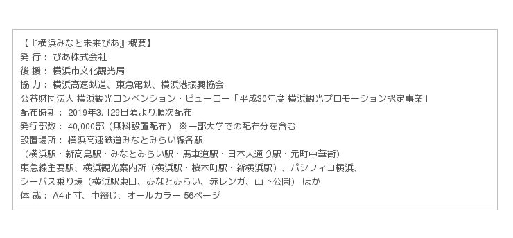 3月29日、ぴあ株式会社より、フリーペーパー『横浜みなと未来ぴあ』を発行。横浜高速鉄道みなとみらい線各駅、東急線主要駅、横浜観光案内所、シーバス乗り場ほかにて配布を開始いたしました。