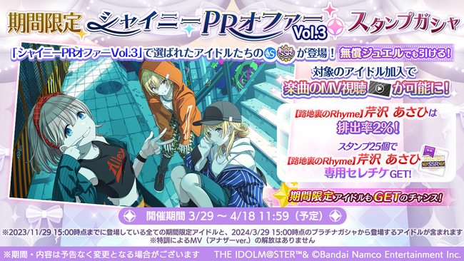 ※「期間限定 シャイニーPRオファーVol.3スタンプガシャ」「有償限定 期間限定 SSR最大4倍!シャイニーPRオファーVol.3ステップアップガシャ」の内容は、「SSRサポートアイドル【路地裏のRhyme】芹沢 あさひ」と、2023年11月29日15:00時点までに登場している期間限定アイドルと、2024年3月29日15:00時点のプラチナガシャから登場するアイドルが含まれます。