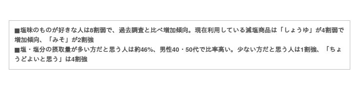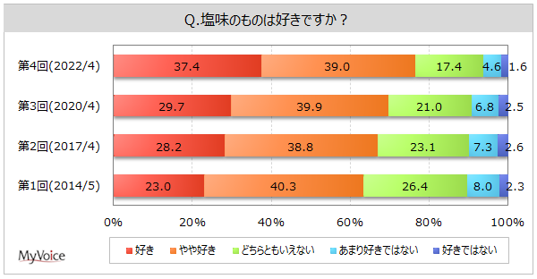 【塩・塩分に関する調査】塩味のものが好きな人は8割弱で増加傾向。塩・塩分の摂取量が多い方だと思う人は約46%、男性40・50代で比率高い