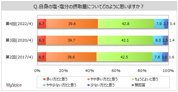 マイボイスコム株式会社(東京都千代田区、代表取締役社長:高井和久)は、インターネット調査を中心に提供しているリサーチ会社です。この度、4回目となる『塩・塩分』に関するインターネット調査を2022年4月1日〜5日に実施し、10,066件の回答を集めました。調査結果をお知らせします。