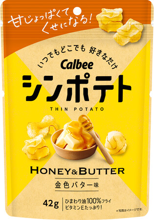●『シンポテト 金色バター味』は、金色に輝くはちみつの甘みと発酵バターのコクや風味が楽しめる、甘じょっぱい味わいがクセになるポテトチップスです。