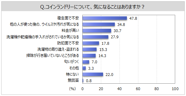 【コインランドリーに関する調査】コインランドリーについて気になることは「衛生面で不安」が5割弱、「他の人が使った後のウイルスや汚れ」「料金が高い」「洗濯機や乾燥機の手入れ」が3割前後