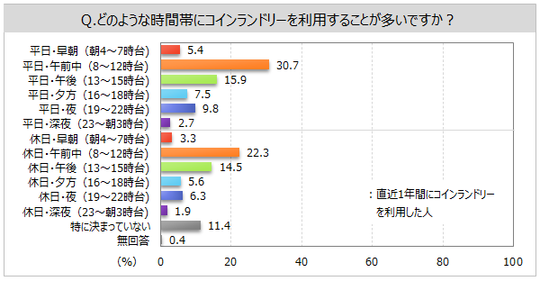 直近1年間にコインランドリーを利用した人が利用する時間帯は(複数回答)、「平日・午前中(8〜12時台)」「休日・午前中(8〜12時台)」がボリュームゾーンです。女性や高年代層では「平日・午前中」、女性10・20代では「休日・午前中」「休日・午後」の比率が高くなっています。男性30代では、「平日・夜」「休日・夕方」「休日・夜」が高い傾向です。
