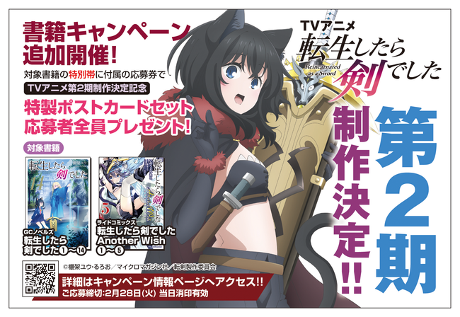 マイクロマガジン社(東京都中央区)は、TVアニメ『転生したら剣でした』第2期制作決定を記念し、原作小説『転生したら剣でした』(GCノベルズ)とスピンオフコミック『転生したら剣でした Another Wish』(ライドコミックス)を対象とした書籍キャンペーンを開催中です。