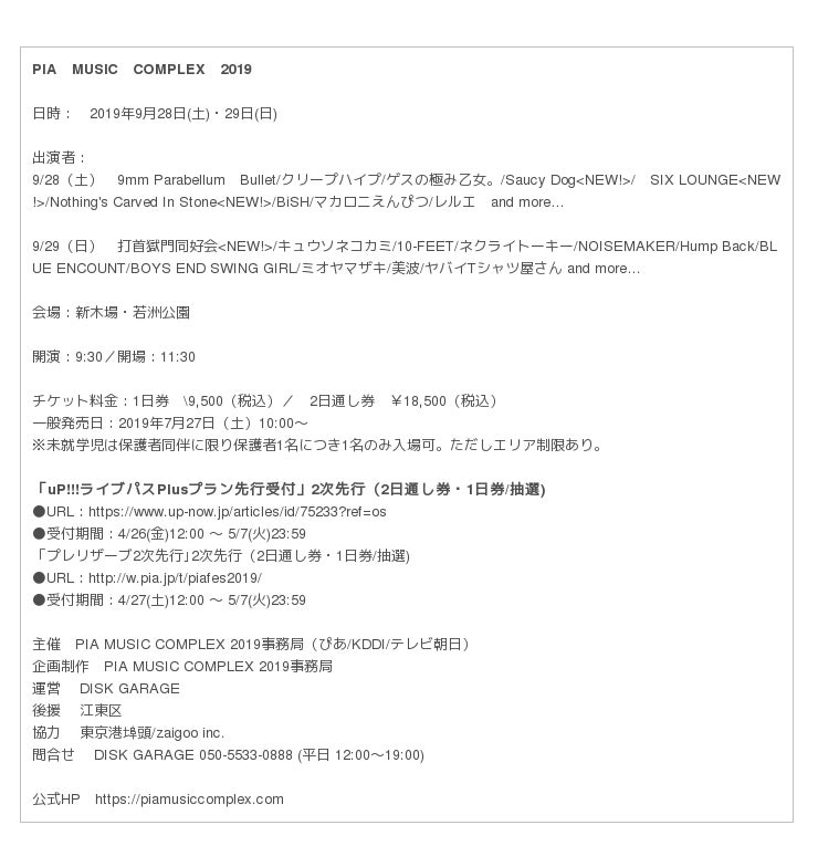 #ぴあフェス 9/28(土)・29(日)@新木場・若洲公園 『PIA MUSIC COMPLEX 2019』出演者第2弾&日程別ラインナップ発表!!!