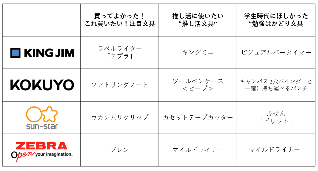 『推し活に使いたい“推し活文具”』に関するアンケートでの各社の第1位は、コクヨ「ツールペンケース<ピープ>」、キングジム「キングミニ」、サンスター文具「カセットテープカッター」、ゼブラ「マイルドライナー」となりました。これらの文具は、推し活の中で重宝されるカラーバリエーションや、推しを見せる、推し活の思い出を整理できるという点などが評価され、ランクインしました。[画像7: https://prcdn.freetls.fastly.net/release_image/48998/1211/48998-1211-c6badbfd5a6edfb50287cdab13019e76-920x518.jpg?width=536&quality=85%2C75&format=jpeg&auto=webp&fit=bounds&bg-color=fff ]