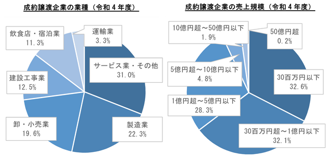 ●<資料2>成約譲渡企業の業種別の割合、売上規模別の割合は以下の通り。業種、売上規模ともに、割合は概ね例年と同様となっている。