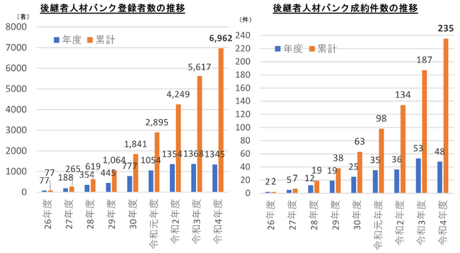 また、創業希望者と後継者がいない中小企業・小規模事業者の事業引継ぎの橋渡しを行う後継者人材バンク事業は、登録者数が1,345者、うち成約まで至ったものが48件と前年度並みの実績となりました。本事業の累計登録者数は、6,000者を超え6,962者となり、うち累計成約件数は235件となっています(資料3参照)。