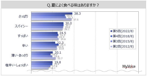 夏によく食べる味は(複数回答)、「さっぱり」「スパイシー」が各30%台、「すっぱい」「辛い」が各2割強です。「さっぱり」「すっぱい」は女性、「塩辛い・しょっぱい」は10〜30代で高くなっています。