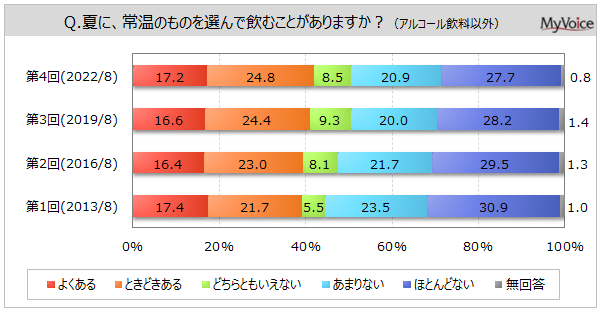 夏に、アルコール以外の飲みものを常温で飲むことがある人は4割強です。男性4割弱、女性5割となっています。
