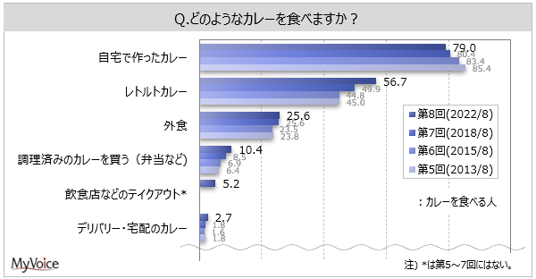カレーを食べる人に、どのようなカレーを食べるかを聞いたところ(複数回答)、「自宅で作ったカレー」が79.0%、「レトルトカレー」が56.7%、「外食」が25.6%です。