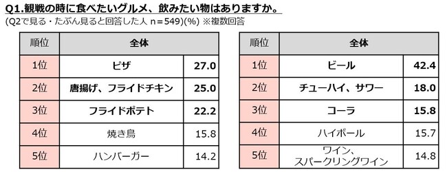 観戦にはビールが欠かせない!ピザ、唐揚げ、ポテトは人気グルメのTOP3!