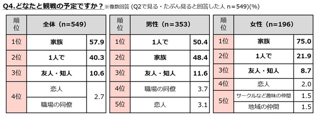 ・観戦する相手は「家族」が6割。男性では「1人」が最多。