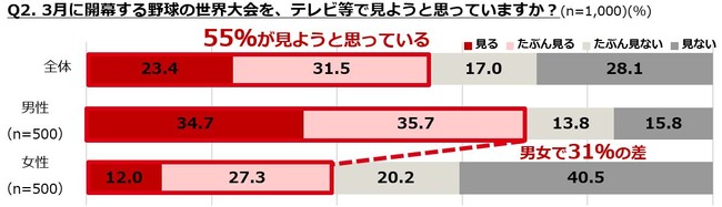 ・3月に開幕する野球の世界大会を見ようと思っている人は55%、男性70%に対し女性は39%。