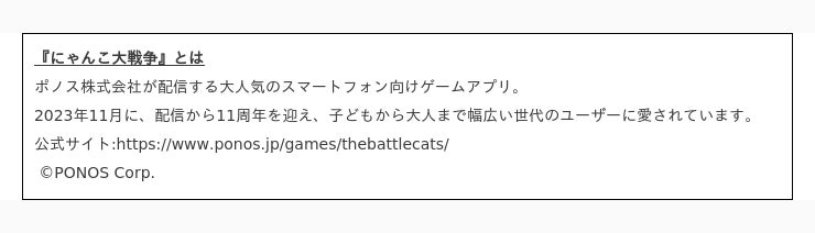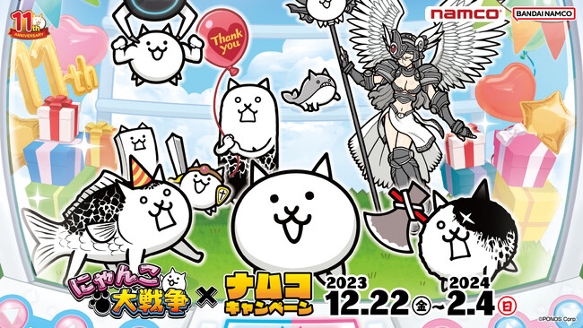 株式会社バンダイナムコアミューズメントは、サービス開始11周年を迎えた『にゃんこ大戦争』とのキャンペーン「にゃんこ大戦争×ナムコキャンペーン」を全国のアミューズメント施設「ナムコ」にて2023年12月22日(金)〜2024年2月4日(日)まで開催します。