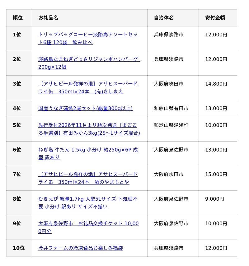 ■<近畿版>2025年ふるさと納税人気お礼品ランキング(確定)