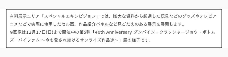 これまで制作された300を超えるサンライズブランド作品の中から、制作資料・玩具などを中心に、厳選したアイテムを約300点展示する期間限定イベントです。