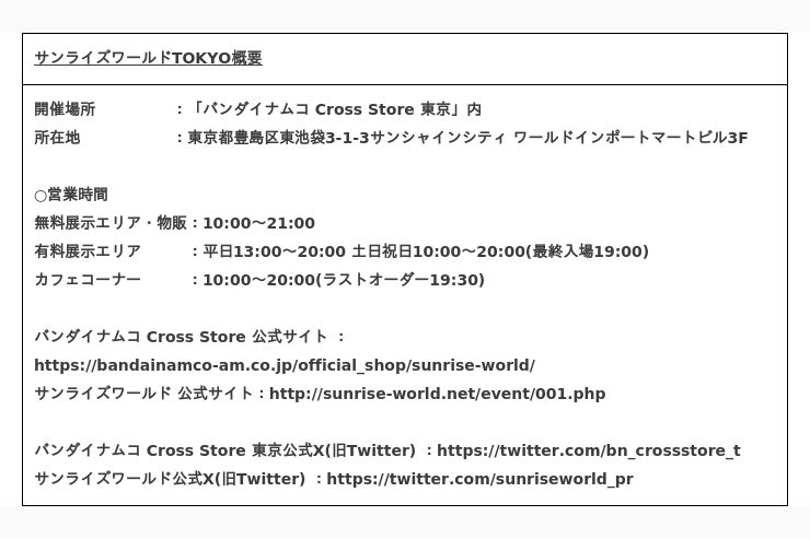 「サンライズワールドTOKYO」について