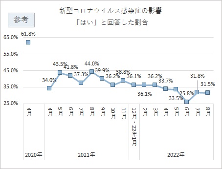 全体で31.5%が「はい」と回答し、新型コロナウイルス感染症の影響を受けて仕事探しをしていた割合は3割程度となった。前回調査とほぼ同値となった。 希望雇用形態別に影響の有無をみると、「正社員」と「パートまたはアルバイト」では3割超となったが、「契約社員または嘱託社員」と「派遣社員」では3割を切った。