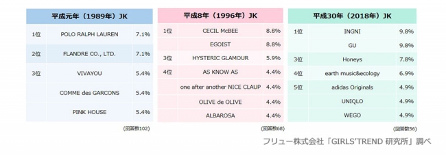 平成8年:CECIL McBEE・EGOISTの“ギャルブランド”が人気、安室奈美恵さんブームが顕著に/平成30年:INGNI・GUの“プチプラ”が上位、“自分に似合う”ファッションや美容を重視