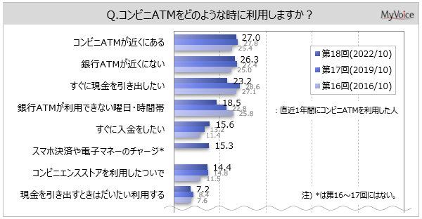 ■コンビニATMの利用場面は、「コンビニATMが近くにある」「銀行ATMが近くにない」「すぐに現金を引き出したい」が直近1年間利用者の各20%台。2019年調査と比べて、「すぐに現金を引き出したい」が減少
