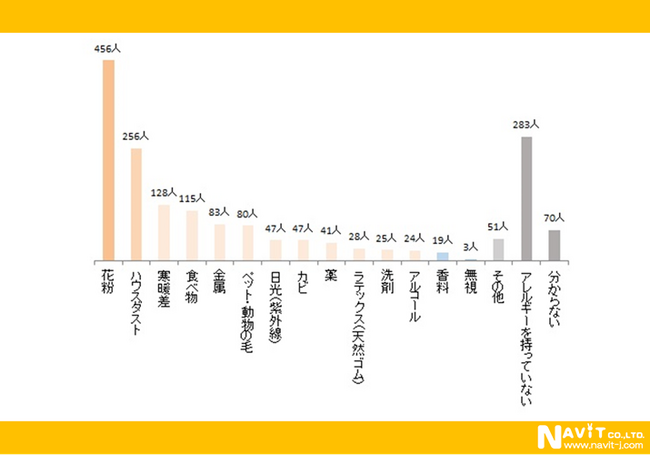 どんなアレルギーを持っているかの問い(複数回答可)には、「花粉」がトップで456人でした。次いで多いのは「ハウスダスト」256人、「寒暖差」128人、「食べ物」115人でした。