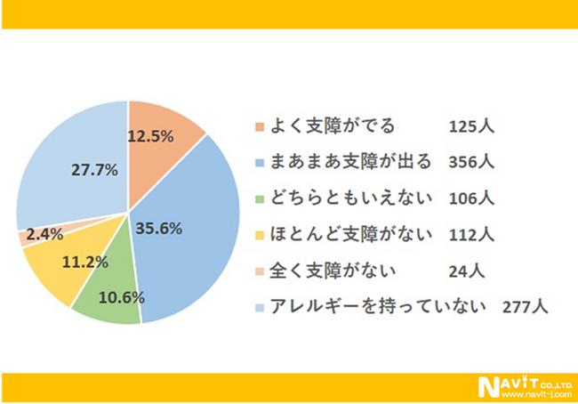 アレルギーによって出る支障については、「よく支障が出る」125人と「まあまあ支障が出る」356人。これに対して「ほとんど支障がない」112人と「全く支障がない」24人でした。