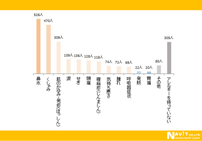 アレルギーで出る症状を複数回答可で質問したところ「鼻水」526人、「くしゃみ」470人、「肌のかゆみ・発疹」309人が上位を占めました。