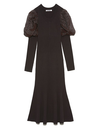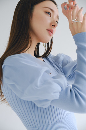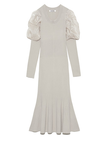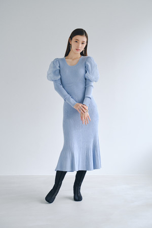 袖はオーガンジーのパフスリーブが重なったようなデザインにし、微光沢で華やかに、パフスリーブでトレンド感を意識しました。シルエットは女性らしいボディラインを強調するフェミニンなマーメイドラインで、エレガントなフォルムに。二ットとオーガンジーの軽やかさがベストマッチし、上品なデザインに仕上げました。