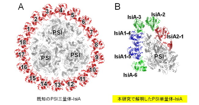 A:既に報告されているPSI三量体-IsiA構造。PSI(灰色)とIsiA(赤色)を図示した。ラベルされているPSIの単量体が三つ結合して三量体を形成する。単一遺伝子由来のIsiAが18個結合し(1~18の番号を付与)、リング状構造を形成する