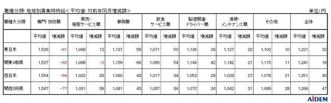 職種大分類別の平均時給は、「専門・技術職」1,526円(前年同月比61円減)、「事務職」1,131円(同58円増)、「清掃・メンテナンス職」1,127円(同22円増)、「製造関連・ドライバー職」1,126円(同29円増)、「飲食サービス職」1,071円(同50円増)、「販売・接客サービス職」1,068円(同12円増)の順で、前年同月比でプラスが5職種、マイナスが1職種となった。