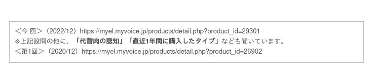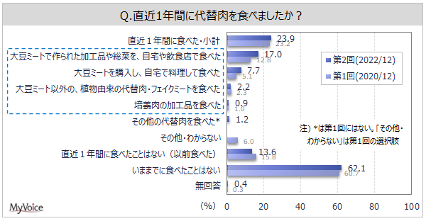 マイボイスコム株式会社(東京都千代田区、代表取締役社長:高井和久)は、2回目となる『代替肉』に関するインターネット調査を2022年12月1日〜5日に実施しました。調査結果をお知らせします。