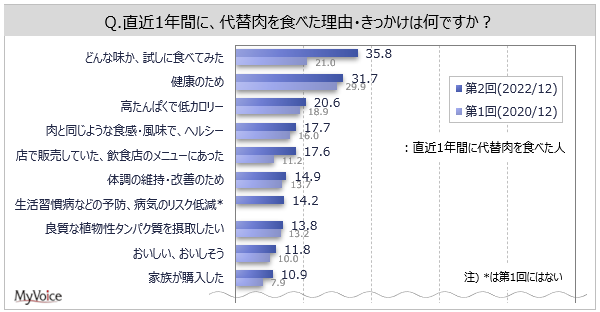 【代替肉に関する調査】代替肉を食べたことがある人は4割弱、直近1年間では2割強。食べた理由・きっかけは「どんな味か、試しに食べてみた」が約36%で2020年調査より増加