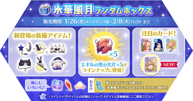 さらに、「氷華風月ランダムボックス」と「睦月パワーアップパック」「アドバンスルーンDXパック」などの新商品の販売を開始いたしました。いずれも期間限定ですので、どうぞお見逃しなく。